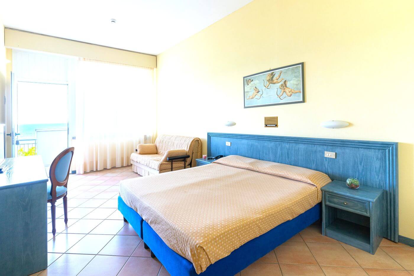 Accomodati nelle nostre camere e goditi lo spettacolo del mare o la magnifica vista sul Monte San Bartolo, dalla finestra della tua camera.